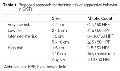 본 논문은 “악성위장관기질종양”의 진단에 있어 원발 부위에 대한 고려가 없다는 것(2002 NIH분류법)이 단점이지만, 병리과학회에서는 2008년도에 발표된 내용이므로 단시간 내에 개정할 계획은 없다고 합니다.